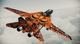 ハロウィーンシーズンを黒とオレンジ色で彩るカボチャお化けのカラーを施した、F-14Dのスペシャルカラー機体です。『お菓子をくれなきゃ撃墜するぞ!』と記されたこの機体に描かれたユーモラスなジャック・オー・ランタンをあなどるなかれ。このF-14Dは低速で可変翼が開いた時に、もう1つの恐るべき姿を現すといいます…。