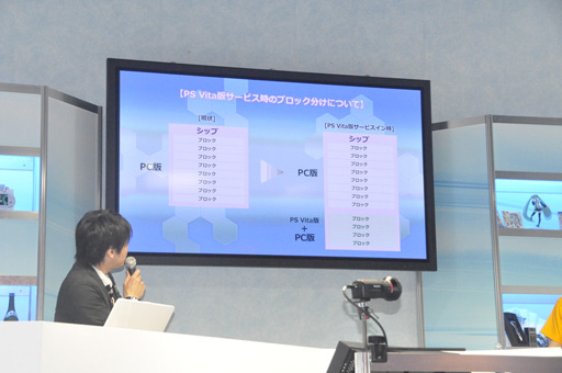 デモプレイが終了すると,以前から言われていた「PS Vita版が出るとPC版の優位性が失われるのではないか」という声に対して,酒井氏は次のように回答した。それは,PS Vita版が発売される際には,PC版のみのブロックに加えて,PS Vita版とPC版が入れるブロックを用意するというものだ。