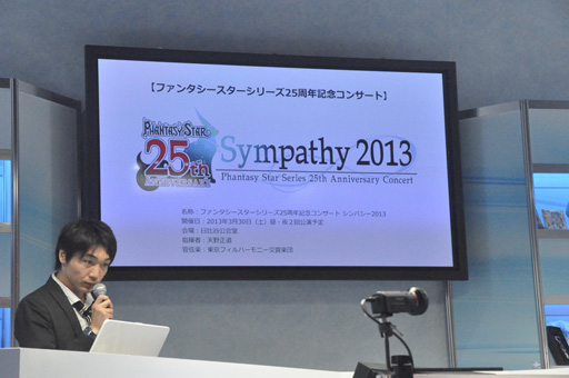そしてステージの最後には,ファンタシースターシリーズ25周年コンサート「Sympathy 2013」が,2013年3月30日に日比谷公会堂で開催されることが発表された。ちなみにコンサート名になっている「Sympathy(シンパシー)」とは,PSO2のサウンドシステムの名前なのだという(関連記事)。酒井氏曰く,「ユーザーと共鳴していきたい」という想いを込めているとのことだ。