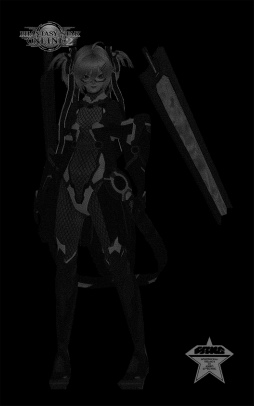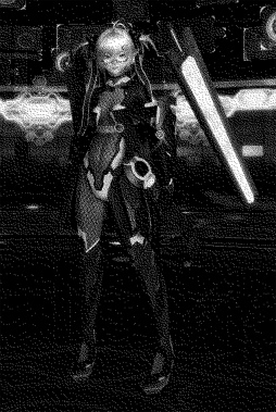 PSO2のゲーム画面はフルカラーだが,3Dクリスタルフィギュアにする過程で,レーザーを当てる座標ベースのデータに変換される。その際,色情報は切り落とされるため,手持ちの環境で類似構成を再現するならば,モノクロ2階調が近しいと判断した。