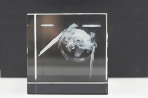 このような流れで出力されたのが,筆者の3Dクリスタルフィギュアである。間近ではなく,やや遠目に眺めることが前提のアイテムなので,再現性としては高いものだと言える。