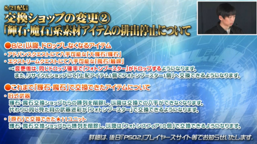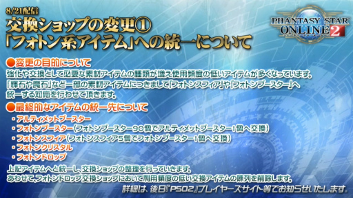 8月21日に予定されている「交換ショップの変更」は,素材アイテムの種類の増加に伴う対応とのこと。一部の素材アイテムが「フォトンスフィア」や「フォトンブースター」に統一される