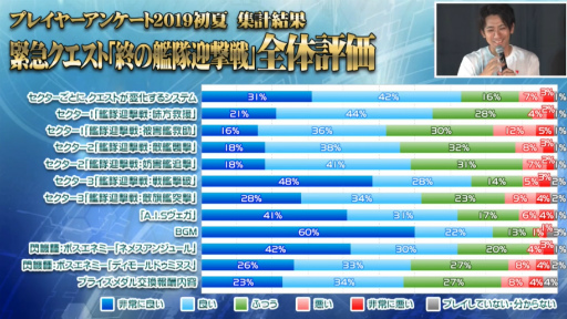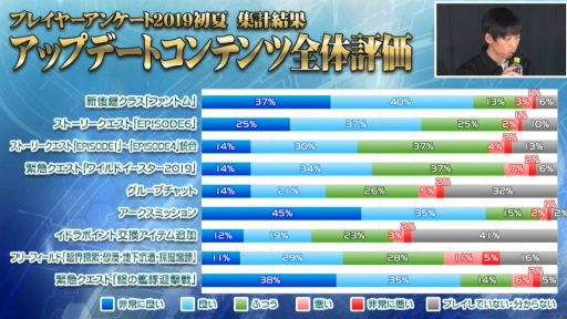 「PSO2 アークスライブ!」のコーナーでは,吉岡氏から8月21日の配信が予定されている「交換ショップの変更」の解説が行われた。また,6月に実施されたプレイヤーアンケート2019初夏の集計結果を元に,EPISODE6の現状や今後の予定にも触れられている。