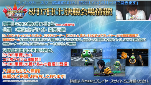 ファンタシースター感謝祭2019 決勝会場は8月17日に東京ビッグサイトにて開催される。来場者特典は「ケロロ軍曹」とのコラボアイテム3種類だ