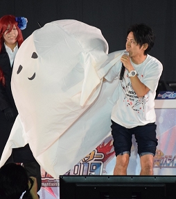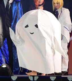 コスプレショーに会 一太郎さんが飛び入り参加。「ゴーストスーツ・ミニ」の衣装(?)に要した制作期間は2時間とのこと