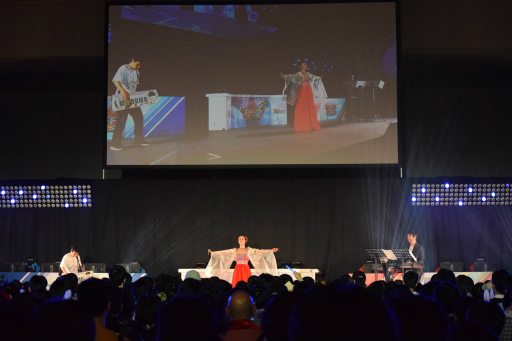 ラストのプログラムは恒例のミニライブだ。神戸会場にはセガゲームスの小林秀聡氏と福山光晴氏,歌手の花れんさんが出演。初披露となる「FINARIA」(EPISODE5 エンディングテーマ)を含む全3曲を演奏し,来場者を楽しませた