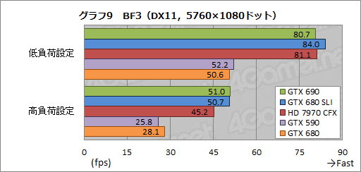 グラフ9はBF3の結果だが,GTX 690のスコアはGTX 680 SLIの96〜101%程度で,ほぼ同じながら,高負荷設定では逆転した。ただ,低負荷設定でHD 7970 CFXと変わらず,厳密にいえば0.4fps低いスコアになっている点や,高負荷設定でもそれほど大きなスコア差が付いていないことからすると,メモリ周りが足枷になっている可能性は高そうだ。