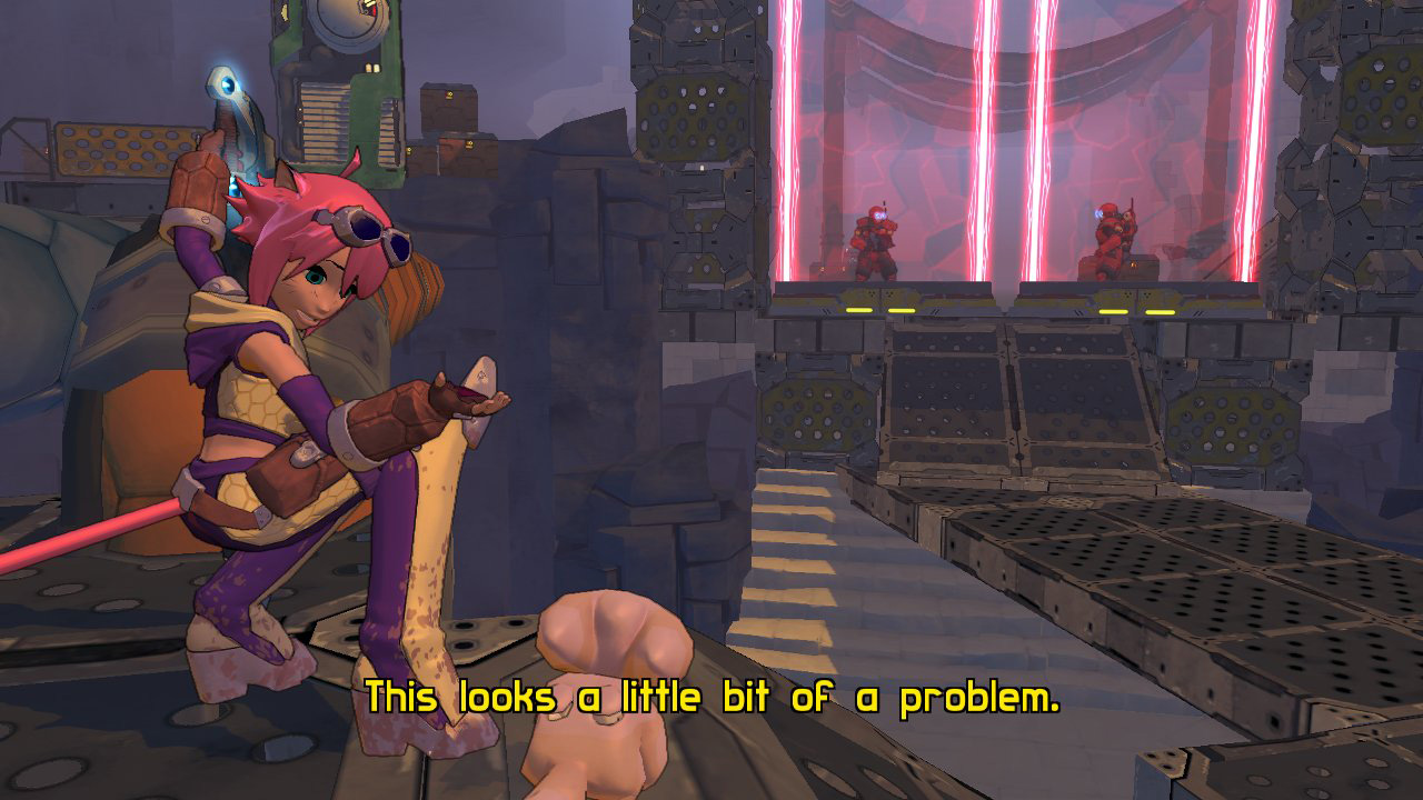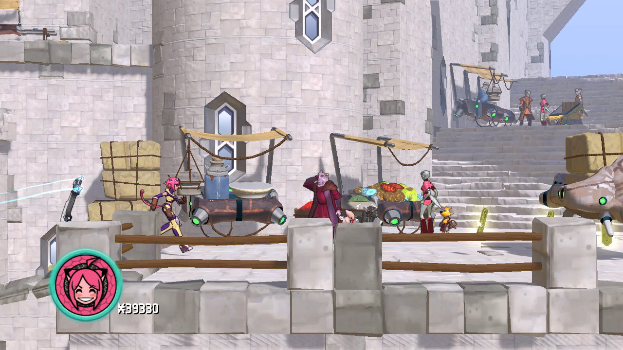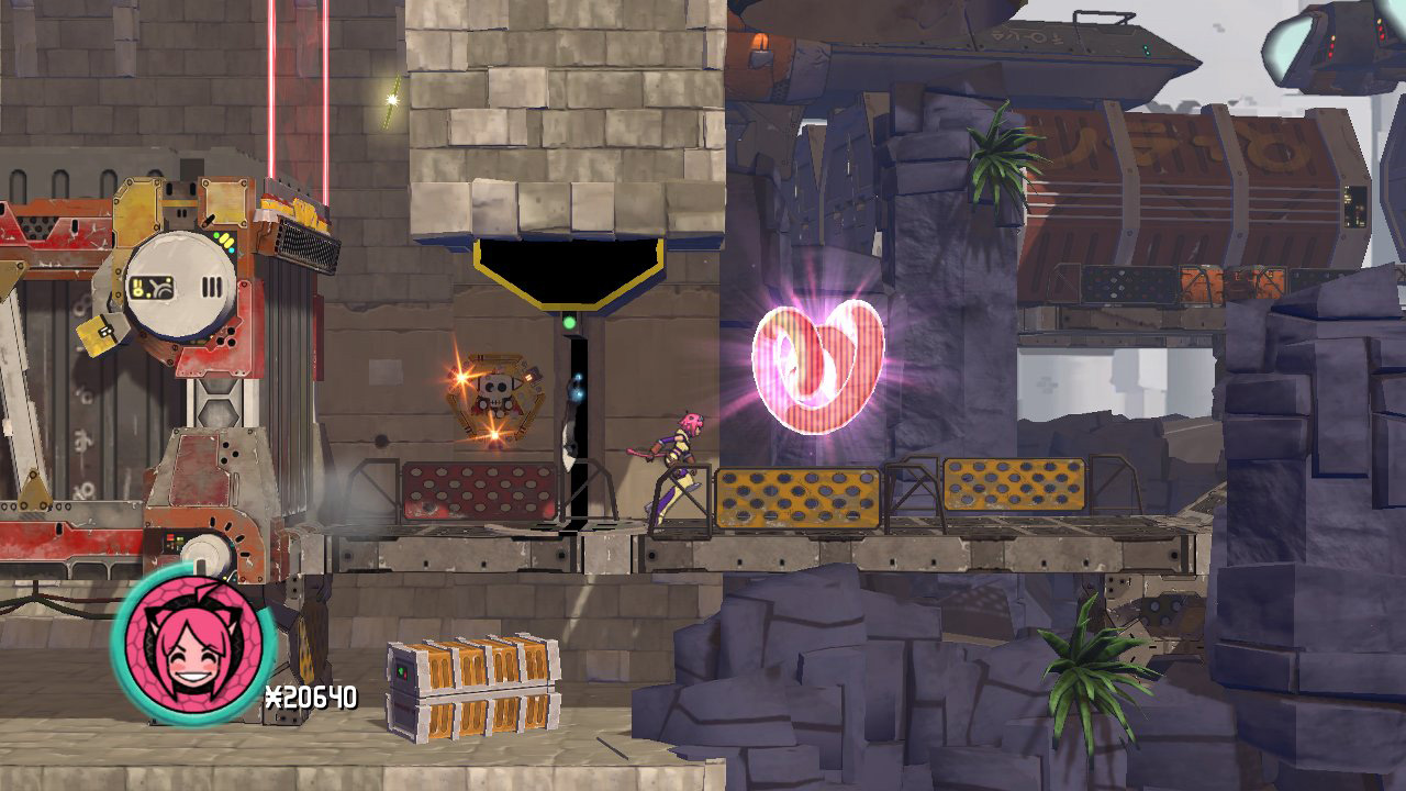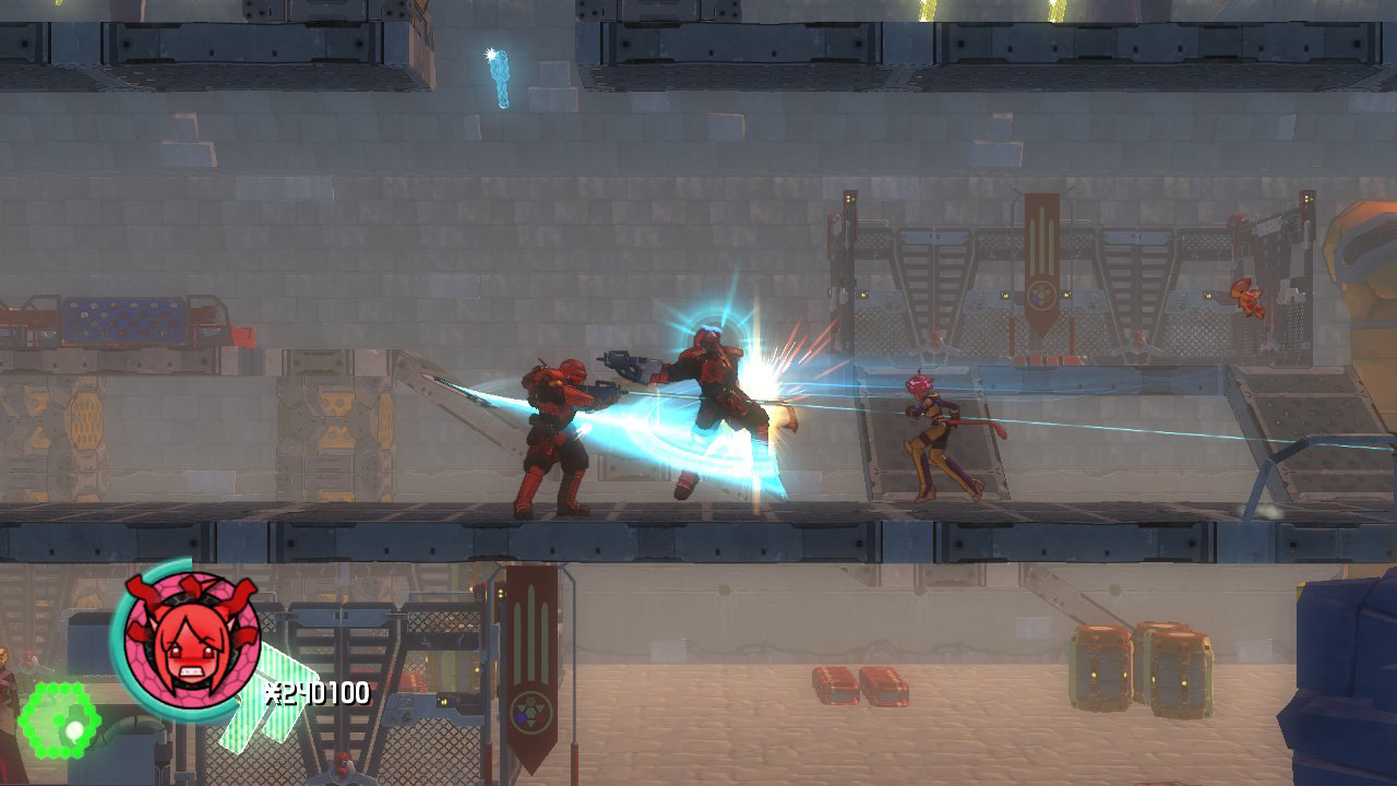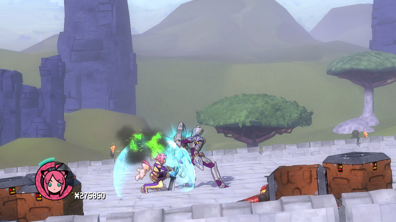 ご覧のとおり,本作のグラフィックスは背景なども含めすべて3Dで描かれているが,ゲーム性はまさに2Dアクションそのもの。Kitは画面の奥や手前に移動したりはできないが,敵の増援が画面の奥から手前に走ってきたり,画面の奥や手前から攻撃してきたりと,3Dならではの演出が盛り込まれている。
