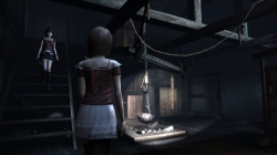 ![]() 【探索する姉妹】 廃屋の囲炉裏を調べる妹。階段の下や梁の上など、廃屋にはたくさんの影がある |