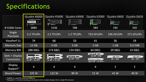 ただし,資料を見ると,性能面と消費電力に関して不可解な点もある。というのも,GTX TITANと比較した場合,CUDA Core数は2688基から2880基へと約7%増大しているのに対し,単精度浮動小数点演算性能は4.5 TFLOPSから5.2 TFLOPSへと,約16%も上がっており,一方でTDP(Thermal Design Power,熱設計消費電力)を比較すると,GTX TITANの250WからQuadro K6000で225Wに下がっているためである(※Quadro K6000の「Board Power」がTDPを指すことはNVIDIAへ確認済み)。