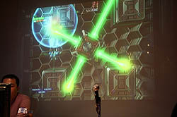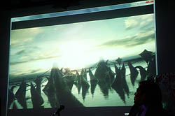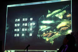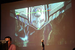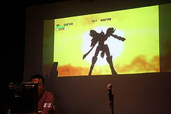続いて,丸山氏自ら開発中のバージョンで実機デモを披露し,まずはタイトル画面とエンディングに主人公らしきキャラクターが表示されることに言及。「ゲーム中には一切出てこないが,かなりハードな設定を持っている」と述べ,80年代の2Dシューティングゲームによく採用されていた懐かしい手法であると説明し,会場に集まった往年のゲーマー達を笑わせた。なお,キャラクターデザインは同社のアーケードゲーム「アンダーディフィート」でも起用した山本七式氏とのこと。