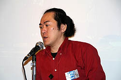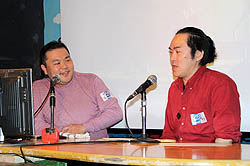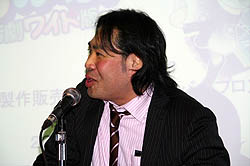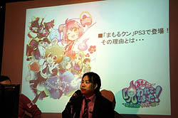 次のコーナーでは,11月4日に正式発表されたサイバーフロントのPlayStation 3用シューティング「まもるクンは呪われてしまった! 〜冥界活劇ワイド版〜」について,開発元であるガルチの茶谷 修氏が,丸山氏とトークを繰り広げた。なお同タイトルは,もともとグレフとガルチが共同開発したゲームで,丸山氏は「グレフが漫画版の原作者で,ガルチがアニメ版を作っているような関係」と説明する。そのため,今回のPS3版に関しても,丸山氏が全面的に監修するとのこと。