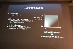 に限られる。2つのパラメータで一意に決まる式になることから,2次元でテーブル化してテクスチャに格納してやることで大幅な高速化を実現している。素材などに関係しない部分なので,一つのテーブルを用意しておけばどんな素材にでも使える。