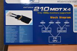 GeForce 210 MDT X4は,GPUにNVIDIA GeForce GT 218を採用しており,DVI×4出力に対応。Integrated Device Technologyの「VMM1402」を2つ搭載し,2つの出力をそれぞれ分割することで4画面出力を可能にしている。解像度にまつわる制限はGeForce GTX560 Ti MDT X5と同じだという。