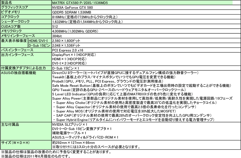ASUS,電圧変更ボタンなどが付属したOC向けカード「MATRIX GTX580」