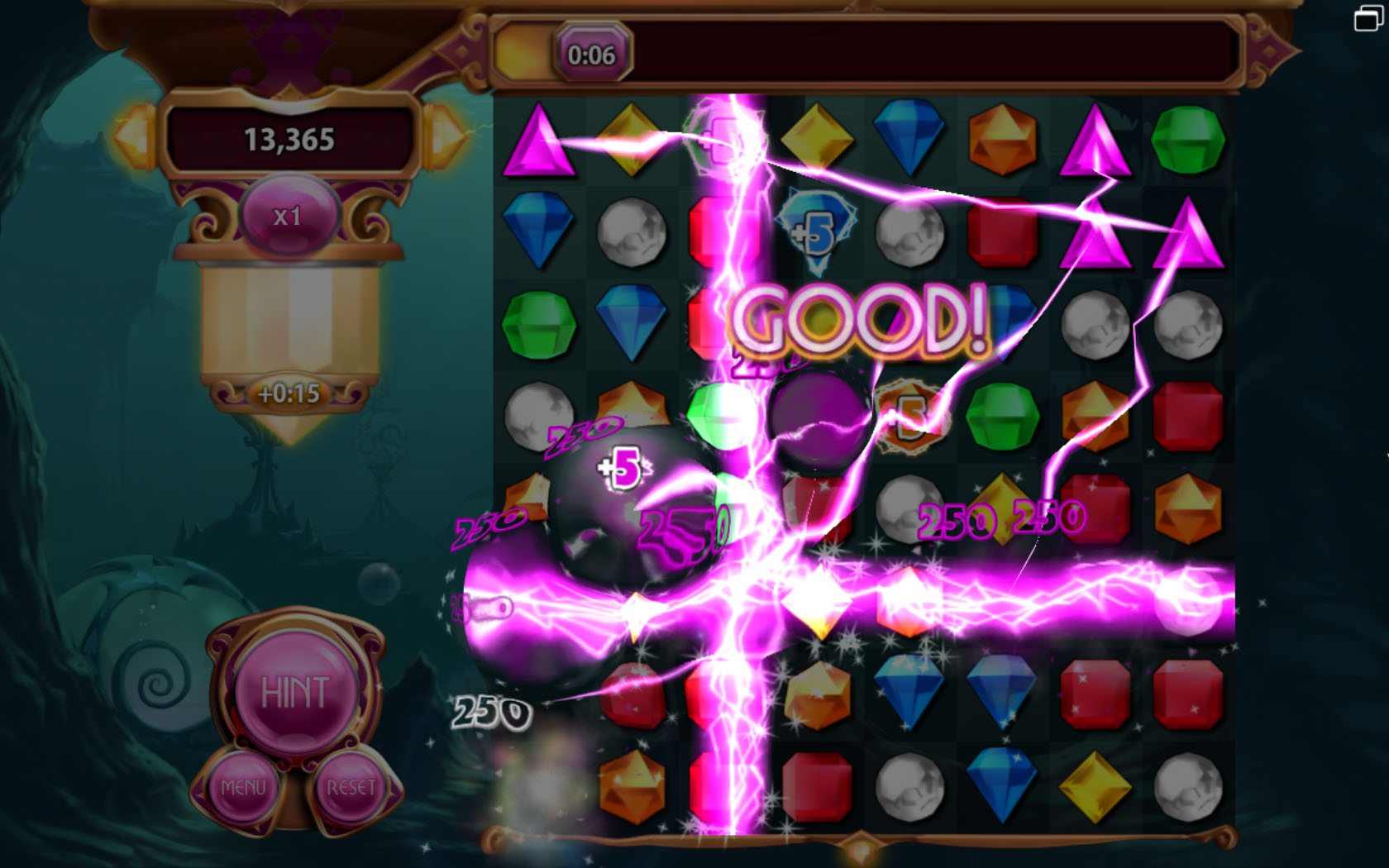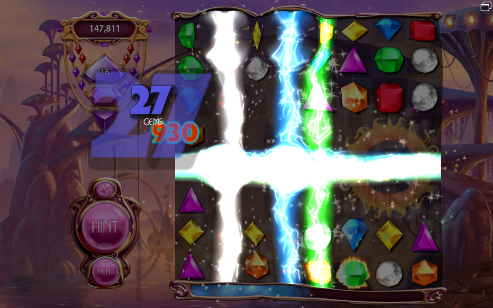 ちなみに6個の宝石を一度に消すと,スーパーノヴァジェムが出現する。このジェムは,消えるときに3行×3列の宝石を一度に吹き飛ばす大爆発を起こすので,とんでもない高得点が得られる。