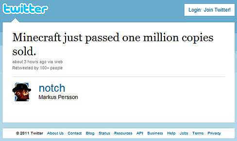 現在,ネット上で大旋風を巻き起こしているインディーズゲーム「Minecraft」だが,ついに100万本のセールスを達成したことが明らかになった。これは,Minecraftの制作者である“ノッチ” (Notch)こと,Markus Persson氏が,自身のTwitterのコメントで明らかにしたものだ。