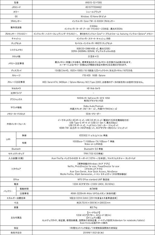 Acer Nitro 5「AN515-52-F58G」 11月21日(水)発売開始