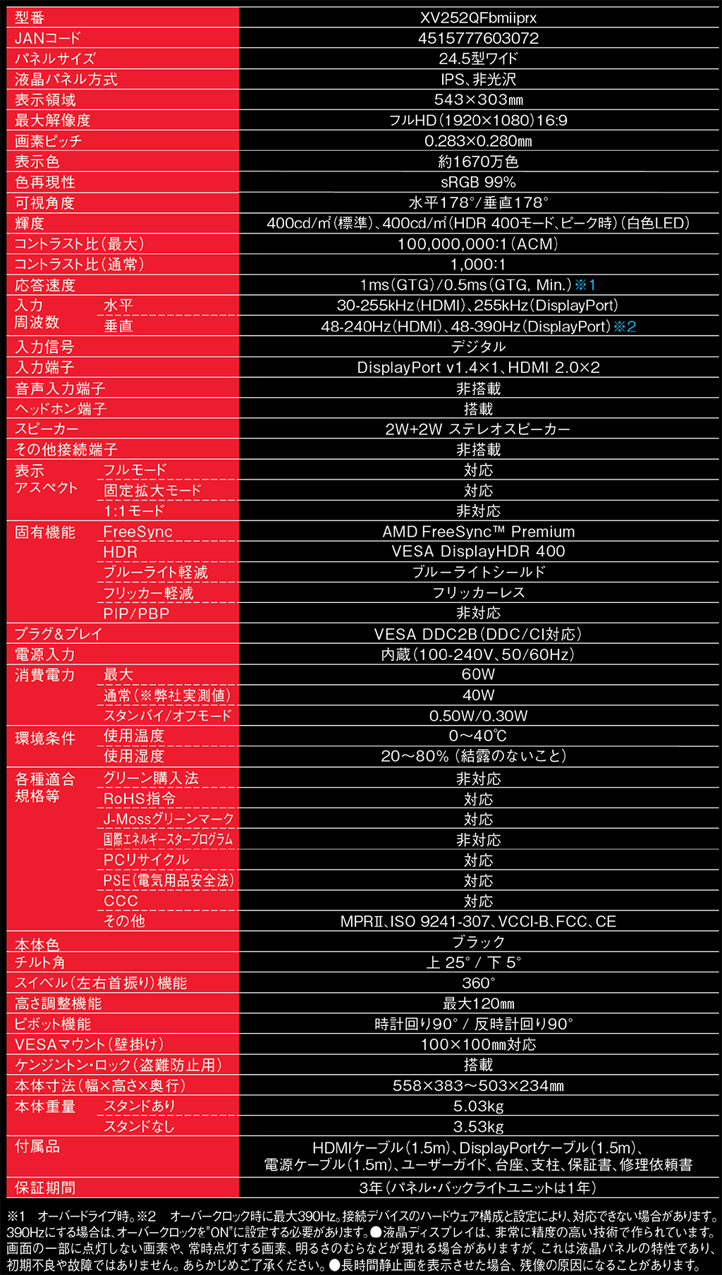Acer,最大390Hz表示に対応したeスポーツ向け24.5型フルHD液晶ディスプレイを国内発売