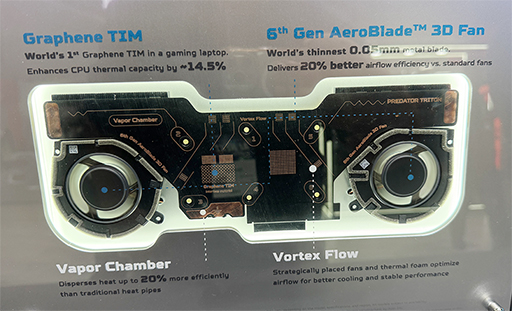 Acerによると,サーマルグリスを用いた従来のTIMと比べて,熱容量が14.5%大きく,効率的な冷却が可能だという。グラフェンを通じてCPUの発熱を処理する冷却機構には,改良したファンとベイパーチャンバーを採用しているそうだ。