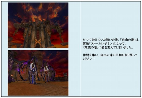これまで全てのプレイヤーが集い、旅立ちの拠点としていた「自由の港」は、宿敵「ストームレギオン」によって、炎と化し、「荒廃の港」へと、その姿を変貌させました。難易度を増した、12人以上の大人数で挑戦する、「荒廃の港」ダンジョンは、チームでの連携が試されます。