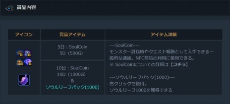 期間中にゲームに1時間以上ログインした日数に応じて最大で「SoulCoin10D」をプレゼント!さらに、今回は大型アップデート記念といたしまして、10日間以上遊んでいただくとワールドツリーモールの一部アイテムを購入できる「ソウルリーフ」をプレゼント!