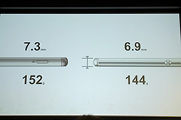 Xperia Z3(左)とXperia Z4(右)の厚さを比較したスライド