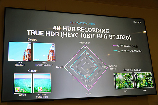 ソニーモバイルの主張によると,Xperia XZ2は,スマートフォンとしては初めて,4K HDRでのビデオ撮影に対応するという。ビデオ撮影時の最大ISO感度は4000だ。記録フォーマットは「True HD」(HEVC 10bit,