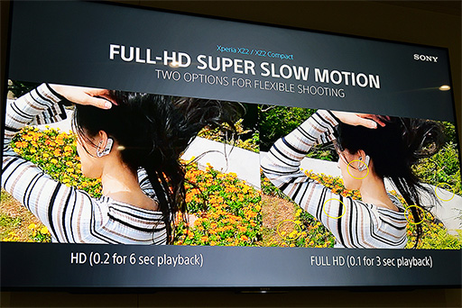 ちなみに,高速度撮影機能では,カメラ用センサーモジュール直下に備えたDRAMをバッファとして利用するのだが,バッファ用DRAMの記録容量自体は,従来製品と変わっていないという。そのため,従来の1280×720ドットでは0.2秒分の録画映像を長さ6秒の出力映像としていたが,Xperia XZ2の1980×1080ドットによる撮影では,0.1秒分の録画を長さ3秒の出力映像として再生するようになるという。