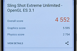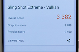 まず,3DMarkのスコアは,Sling Shot Extreme Unlimitedが「4552」,Sling Shot Extreme Vulkanは「3382」で,ほかのSnapdragon 845搭載機に比べるとやや低い結果となった。とはいえ,動作を見る限りでは,体感できるほど性能差があるわけではなく,ハイエンド端末相応の性能を引き出しているとみていいだろう。