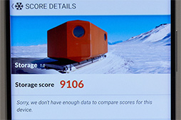 一方で,PCMarkのStorage testスコアは,「9106」と高い。高いのだが,例によってPCMark自体が最近のスマートフォンに対応していない節もあり,今回も「SQLite update」や「SQLite insert」,「SQLite delete」といった項目で,不自然な結果が出ている。