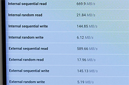 それ以外の細目を眺めてみると,Sequential read(逐次読み出し)の速さが目立つ一方で,Random read(ランダム読み出し)やRandom write(ランダム書き込み)のスコアは,あまり高くない。