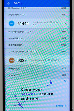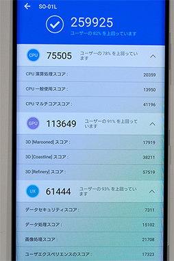 AnTuTu Benchmarkのスコアも,Snapdragon 845搭載機の標準的なスコアといったところ。GPUスコアがやや低い一方で,MEMの項目にあるROMスコアの高さが目立っている。