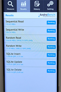 ベンチマークアプリの最後に,AndroBench 5の結果を見てみよう。PCMark for Androidと同じく,逐次読み出し性能は高い。一方,異なるのはRandom readの結果で,こちらは136.46MB/sと良好なスコアとなっている。