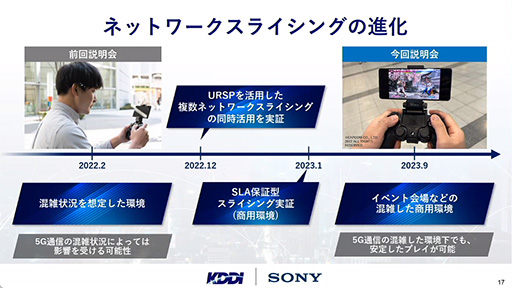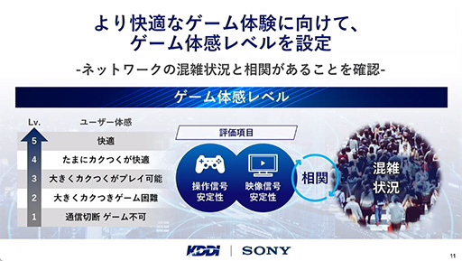 ソニーとKDDIは,これまでもたびたび5G SAを使った実証実験の成果を披露しており,4Gamer.netでも紹介している(関連記事)。今回の実験は,イベント会場から自宅のPS5に接続してリモートでゲームをプレイするという想定で,混雑した環境でも安定して通信できたというのが見どころだ。ただ,実験は混雑した状況に近い負荷をかけて行っており,実際のイベント会場で行ったものではないそうだ。