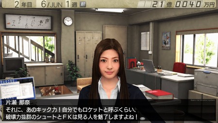 ゲームスタート直後から監督をサポートしてくれる初期の秘書として登場するのが片瀬那奈さん。その美貌もさることながら、サッカーへの愛着も深く、ユーザークラブを強化していくと、彼女もまた成長していきます。癒しの面ではもちろん、経営面でも頼りになる美人秘書です。