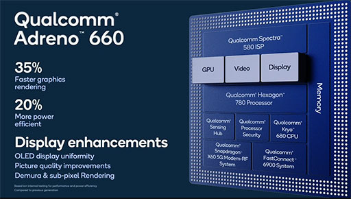 ゲーム用途においてとくに重要な要素であるGPUコアは,Adreno 660に変更となった。例によってQualcommは詳細を明らかにしていないのだが,Snapdragon 888は,Snapdragon 865と比べて,レンダリング性能が35%も高速化したそうだ。加えて,電力効率も20%改善したという。