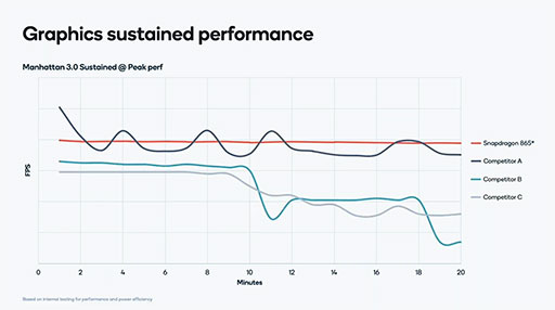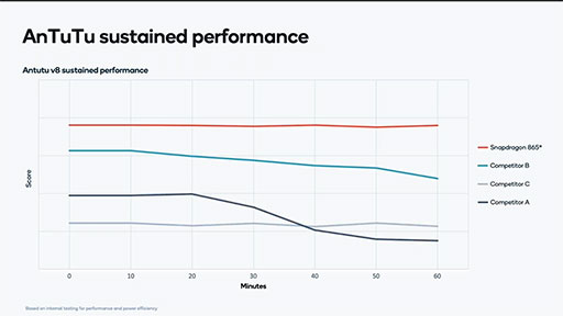 Snapdragon 888において,Qualcommは「長時間の駆動でも安定した性能を発揮できる」と主張する。Qualcommが検証したデータによると,競合製品は連続して動作したときに,性能に波が生じたり,低下したりするという。一方,Snapdragon 888の場合は安定した性能を維持できるとのこと。