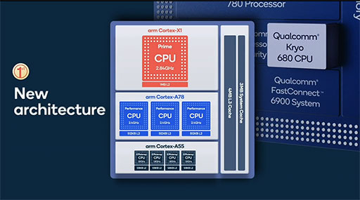一方,CPUコアのKryo 680は,現行のSnapdragonシリーズと同様に,4基の高性能コア(big側)と,4基の低消費電力コア(LITTLE側)を組み合わせたbig.LITTLE構成を採用する。Kryo 680では,big側の高性能コアのアーキテクチャを刷新したのが見どころと言えよう。4基のうち,とくに高い周波数で動作する1基の「Prime Core」がArm製のCPU IPコア「Cortex-X1」に,そのほかの3基がArm製の「Cortex-A78」へと変更になっている。これにより,性能が25%向上し,電力効率も25%改善したという。