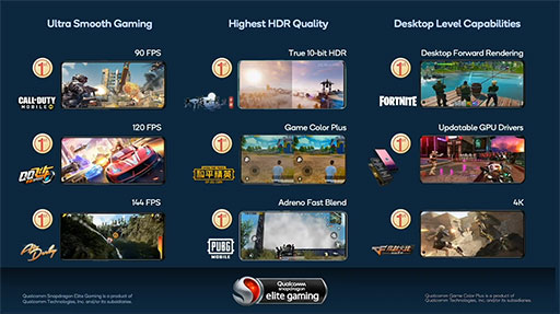 また,Snapdragonシリーズの上位モデルに搭載するゲーム向け機能群「Snapdragon Elite Gaming features」には,新たにタッチ操作の遅延を軽減する「Qualcomm Game Quick Touch」(以下,Game Quick Touch)と,「Variable Rate Shading」(VRS ,可変レートシェーディング)に対応したのが見どころだ。