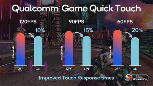 Game Quick Touchは,ディスプレイにおける垂直同期のタイミングやフレーム送信のタイミングなどの原因による操作遅延を軽減するというものだ。Qualcommによると,画面をタッチした結果が画面に表示されるまでの処理を最適化することによって,操作遅延が最大で20%軽減できるという。