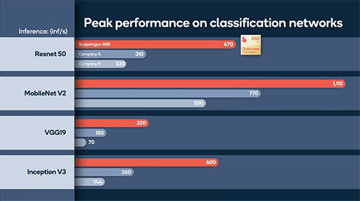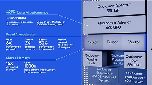 第6世代となったAIエンジンも強力で,新設計のDSP(Digital Signal Processor)「Hexagon 780」が中核となっている。ScalarとVector,Tensorという3つのアクセラレータを改良したほか,3つのアクセラレータが共有するメモリ容量を従来の16倍とすることで,AI推論性能はSnapdragon 865の15TOPSから26TOPSまで向上したとのことだ。