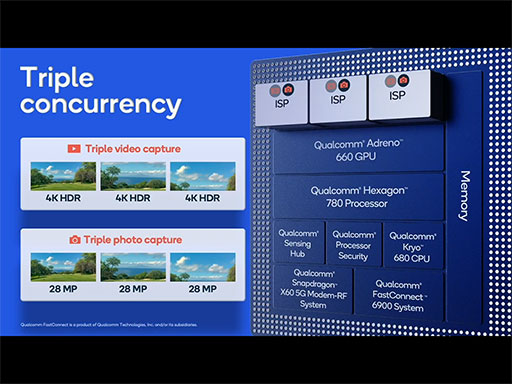昨今のスマートフォンは,3眼式カメラを搭載する製品が多い。ISPが3つになったことで,それぞれのカメラで撮影した画像を同時に処理できるようになった。たとえば,広角と標準,望遠という構成の3眼式カメラを搭載したスマートフォンにおいて,最大2800万画素の写真を3つのカメラで同時に撮影できる。加えて,3つのカメラで,同時に4K解像度の動画を撮影することも可能だという。