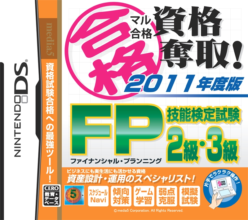 メディアファイブは,ニンテンドーDS用ソフト「マル合格資格奪取! 2011年度版 FPファイナンシャル・プランニング技能検定試験2級・3級」を,2011年6月23日に発売する。きんざいと日本ファイナンシャル・プランナーズ協会,両団体の試験に対応しており,最新の平成22年度を含めた5年分の全過去問題を,解説付きで収録している。