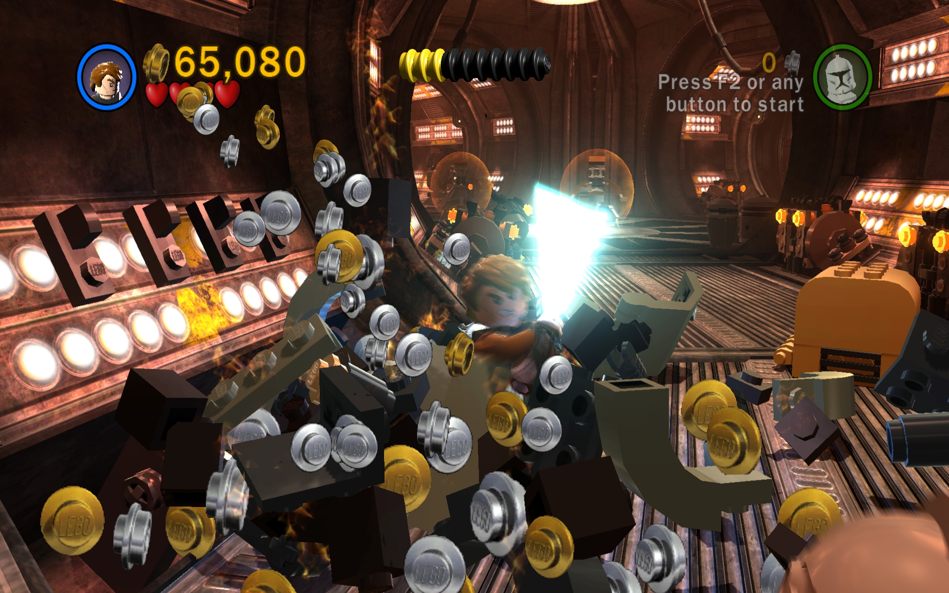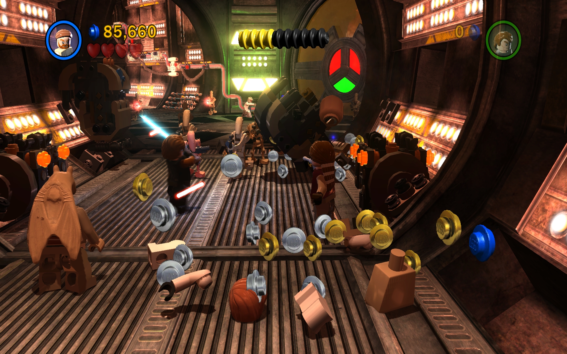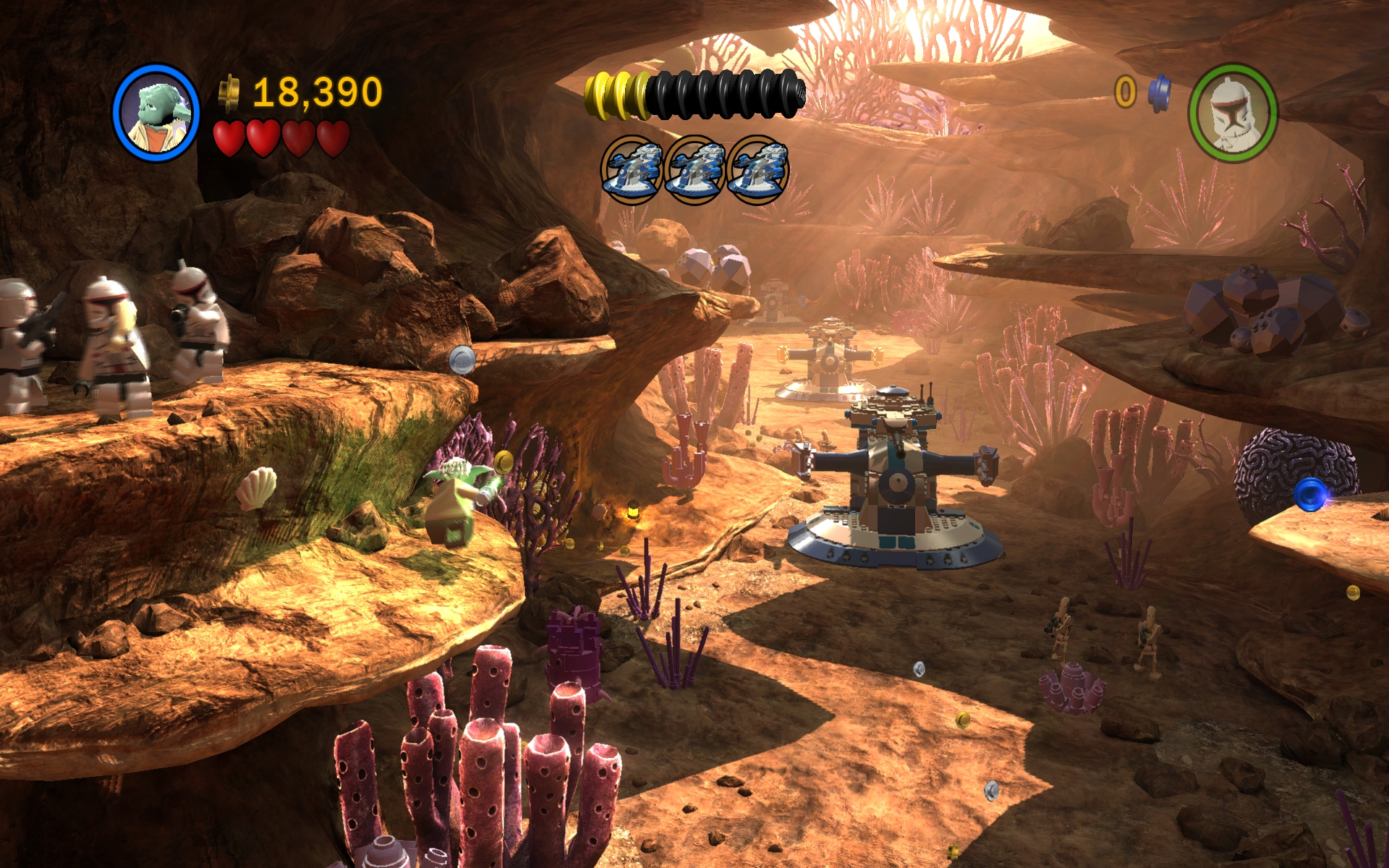 そこで,高い場所にあるクローン・トゥルーパーでしか使えないスイッチを押すのに,アナキンがフォースで足場となる階段を作り上げ,それからクローン・トゥルーパーに切り替えてスイッチを押すといったパズルっぽい要素が随所に盛り込まれており,ここを考えるのがレゴシリーズの面白い部分なのだ。
