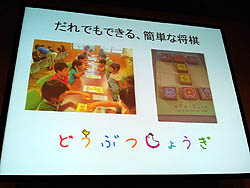 東北大震災の被災地の避難所では高齢者のための娯楽が少なかったため,日本将棋連盟として普通の将棋盤やどうぶつしょうぎを持っていったところ,まず子供がどうぶつしょうぎを覚え,それをきっかけに周囲の大人が将棋を教える,といったコミュニケーションが発生したそうだ。ゲームには確かに,「人をつなぐ力がある」のだ(なお,どうぶつしょうぎはネット上でもプレイできる)。
