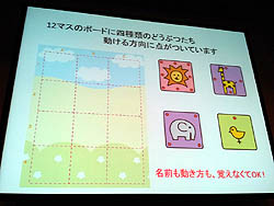 どうぶつしょうぎは3×4マスの狭い盤面に,ライオン,キリン,ゾウ,ヒヨコという四つの駒(プレイヤーが2名なので,合計8駒)でプレイするゲームだ。それぞれのコマには移動方向のマーカーがあり,コマの動かし方で混乱する心配はない。また1ゲームが短いため,「手早く,簡単に楽しめる」工夫もされている。将棋は1ゲーム最低30分程度を必要とするが,1ゲーム30分は現代の指標から見ればもはや「長い」のだ。