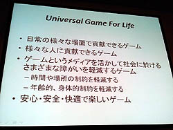 これまではしばしば,デジタルゲームと思考ゲームは違うものだと理解されることがあったが,しかし本来これらはすべてゲームであり,「数百年後にはテトリスも囲碁も将棋もすべて古典ゲームと評価されるだろう」と氏は述べた。そのうえで松原氏は「Universal Game for Life」として,「日常の場面/人に貢献でき,社会に存在するさまざまな障害を軽減する,安心,安全,快適で楽しいゲーム」という概念を提示する。