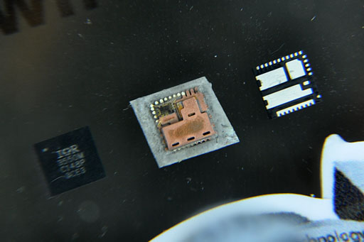 IR3550のチップをバラした状態。拡大鏡越しに撮影したものだ