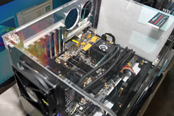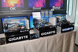 実際,COMPUTEX TAIPEI 2012の会場「TWTC」(Taipei World Trade Center)にほど近い高層ビル「Taipei 101」に設けられたGIGA-BYTEのプライベートブースでは,簡易液冷クーラーのラジエータ部に取り付けられた120mm角ファン以外にエアフローが生じないデモ用PCケース内に,「Core i7-3770K/3.5GHz」が差さった下記の3条件を設定し,